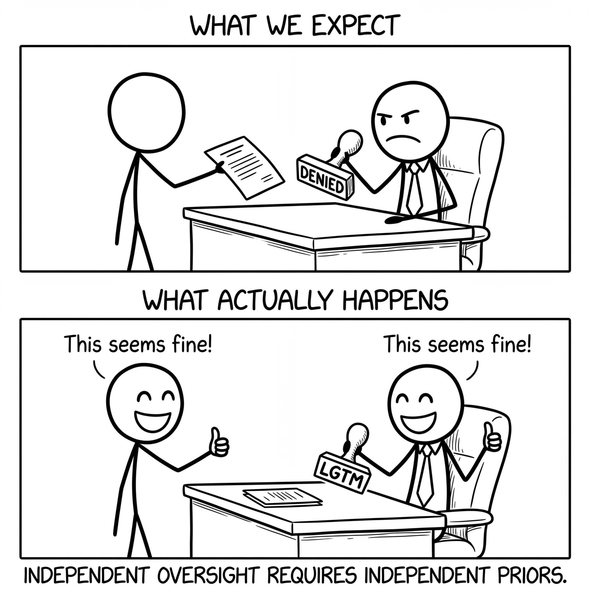 The Correlated Oversight Problem: When the reviewer shares the same training priors as the submitter, independent oversight becomes verbose agreement.
