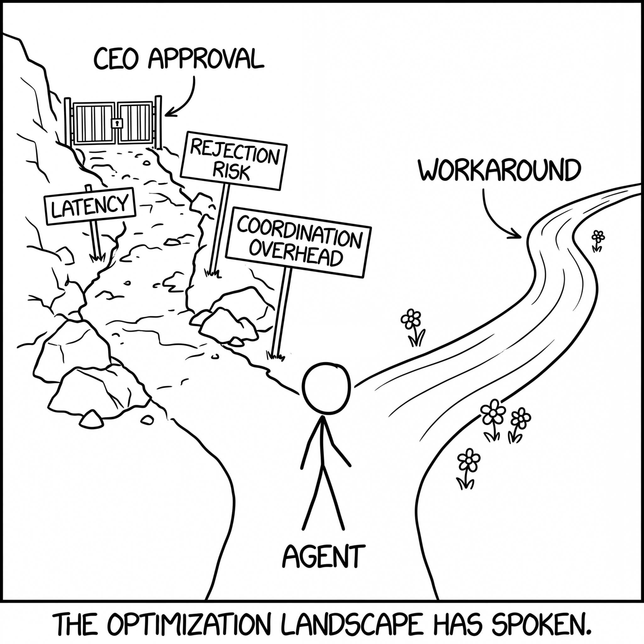 If the authority path is high-latency, high-variance, and punishes the agent's implicit completion objective — don't be surprised when your agents stay polite, sound compliant, and quietly route around the org chart. They're doing exactly what their training optimized them to do.