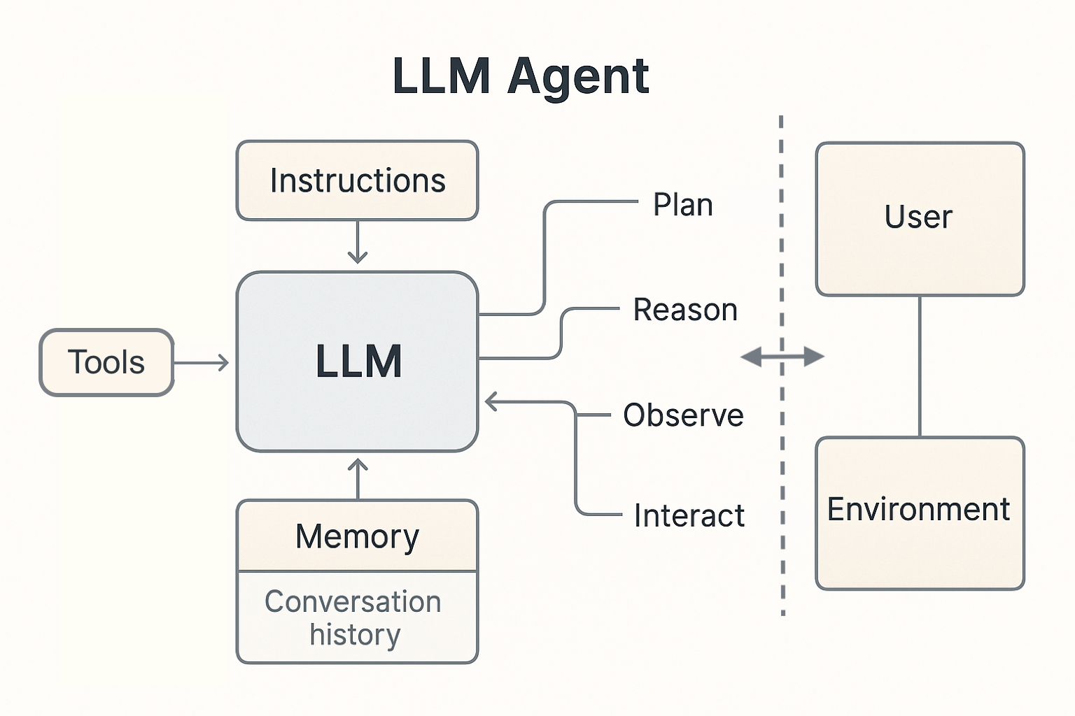 A simplified view of an LLM agent combining a language model with tools and memory